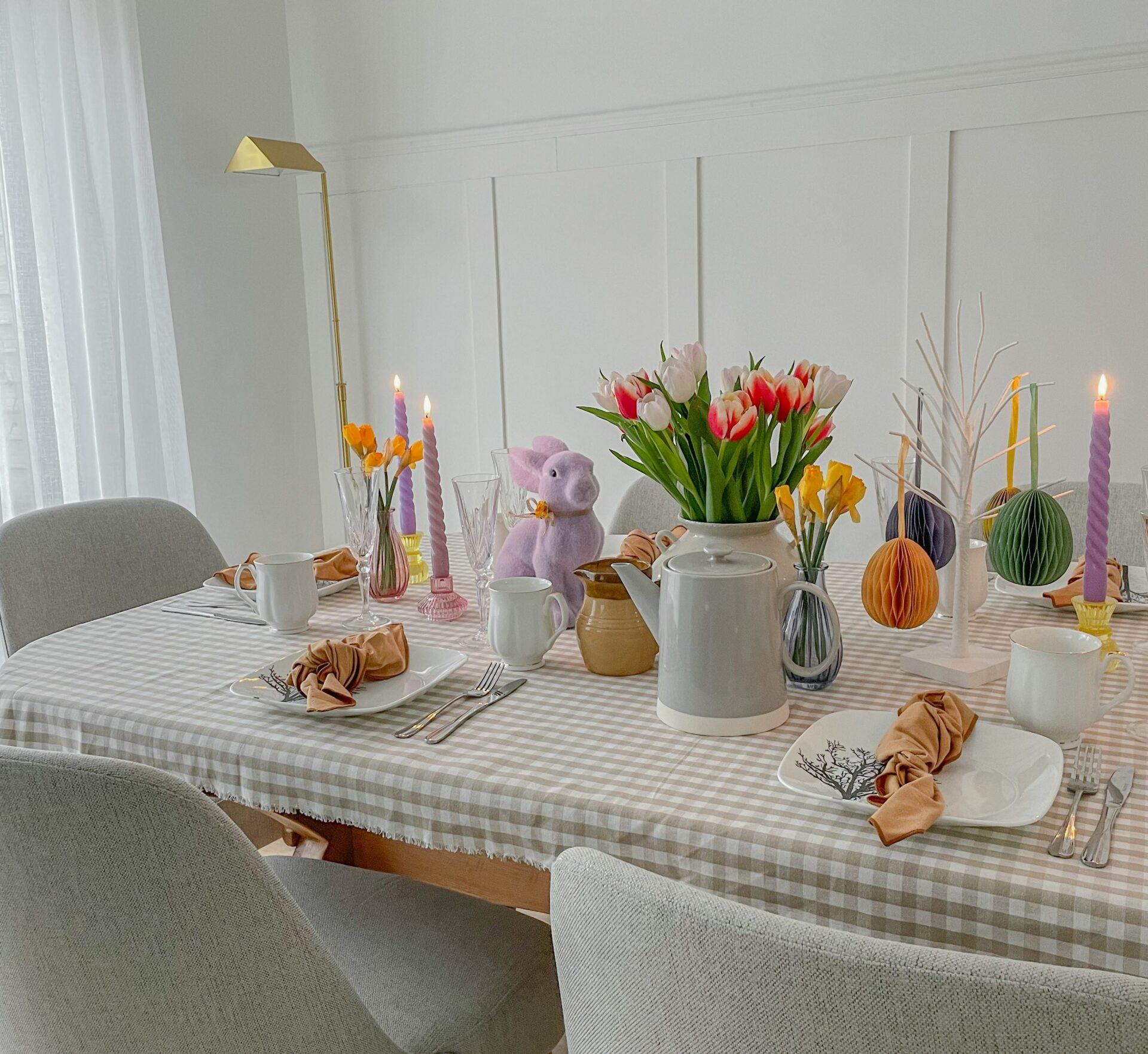 For simple but effective Easter table decor, create a bunny by wrapping a napkin around a pastel-painted egg and tie with ribbon or twine. These beautiful napkins from the Chalk Pink Linen Co are just perfect for this, with matching tablecloths also available.