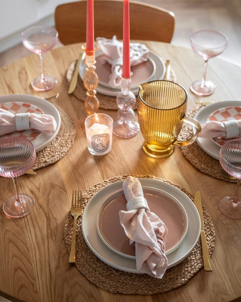 Start with a soft base like a runner or placemats, then add candles for warmth. Keep flowers easy and unfussy. Pink tulips, roses, or even supermarket stems in a jug look relaxed but still celebratory.