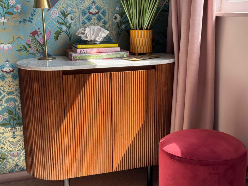 Instead of stacking everything on the coffee table, create a small self-serve area on a sideboard, console, or even a tray on a side table. Keep plates, napkins, glasses and the main snacks together so guests can help themselves. It stops the centre of the room from getting cluttered and keeps things flowing without you having to play host all evening.