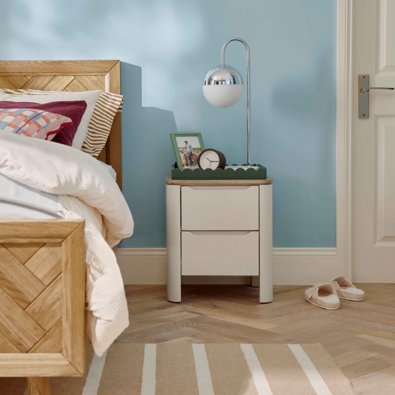 Natural oak furniture grounds the scheme. The Parquet bed and console table provide structure and timeless appeal, while gently curved pieces such as the Otto wardrobe, bedside tables, and Otis chair soften the overall look. Curves are a subtle but important detail within bedroom trends for 2026, bringing a sense of comfort and nostalgic appeal.