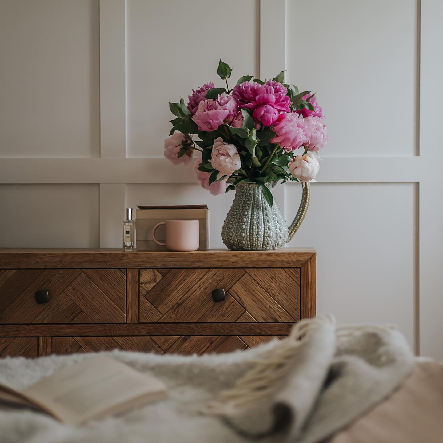 Transform your bedside table into a beautiful vignette with fresh blooms. Easy to create yet offering maximum impact, it’s a welcome change from a cluttered bedside table that echoes boutique hotel chic. Choose flowers that tie in with the colours in your bedroom to create a soothing palette.
