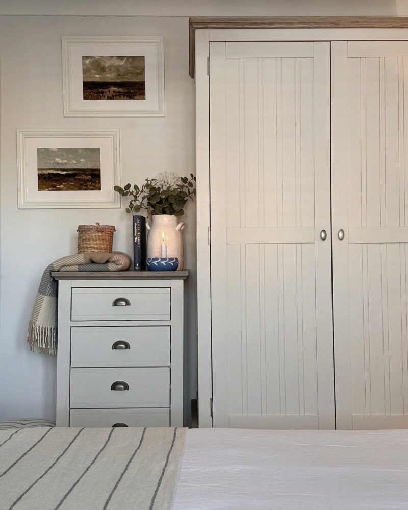 A double wardrobe still provides plenty of hanging space, and choosing ones with drawers means you have more room to store your jumpers, jeans or linens without using up precious hanging space. But make sure you leave enough space! You’ll need around 20cm at the front of your chosen wardrobe to allow for opening the doors and manoeuvring around it. For more info on optimal bedroom layouts, take a look at our bedroom measurement guide.