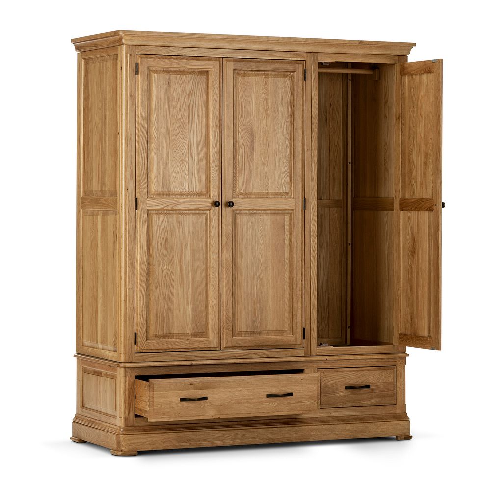 This classically styled triple wardrobe brings storage and style into your bedroom. This Canterbury wardrobe has been designed with lots of space for your clothes storage, and deep drawers, too. It features a double and single hanging area, perfect for those sharing a wardrobe. The drawers are made from solid oak throughout, even the backs, runners, and bases. They also feature real dovetail joints to create a durable and long lasting piece that will look great in your home for years to come.